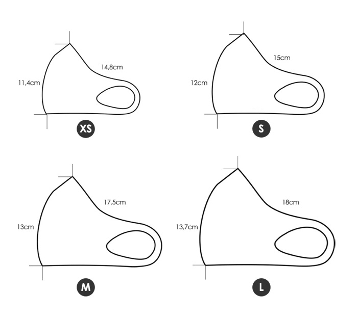 Storleksguide finns här, denna mask har en annan storleksguide än vår andra mask och storleken för dig kan därför skilja sig mellan de två (mät från högst upp på näsbenet ned till hakan).