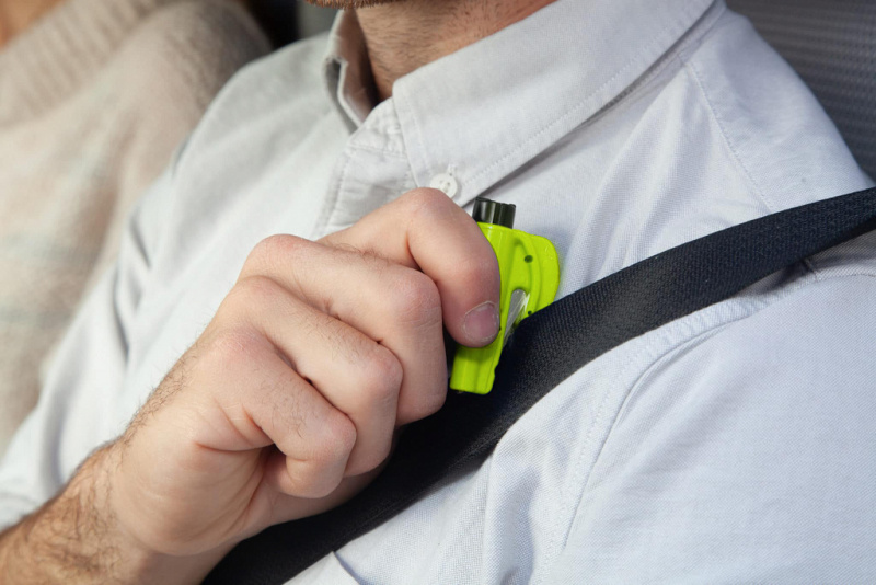 Kom ihåg att bältesskäraren är mycket vass och kan enkelt skära igenom säkerhetsbälten. Håll säkerhetsbältebandet stramt och dra verktyget mot dig och skär det diagonalt.